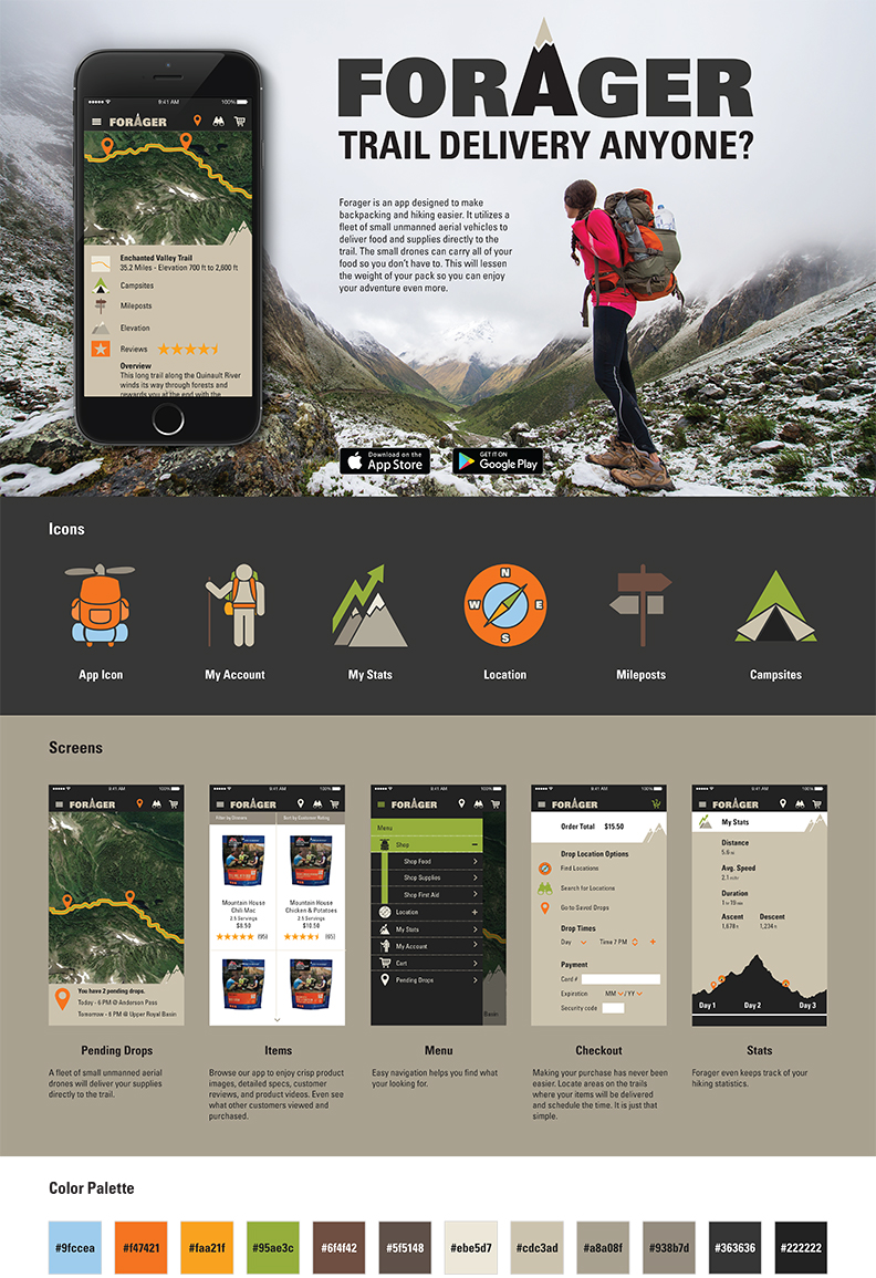 2016 • App Design: Hiking drone delivery app concept involving wireframing, screen, logo and icon design, and user testing. See the prototype here.