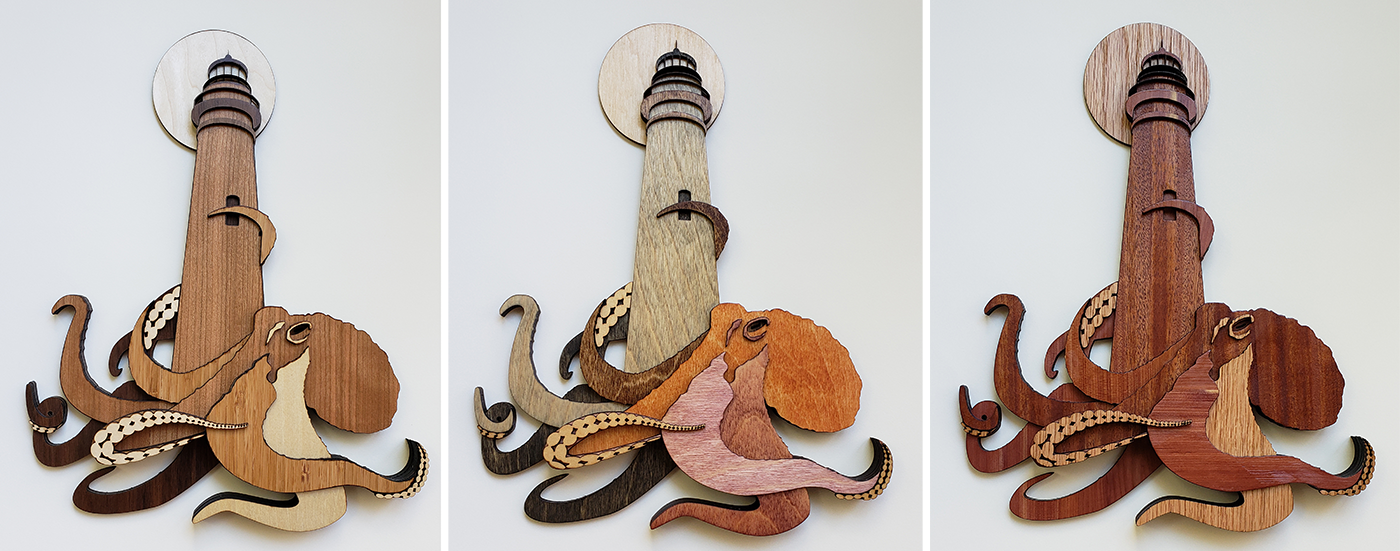 2019 • Laser Design: Laser etched and cut on different types of thin plywood .I experimented with stains to vary each rendition.